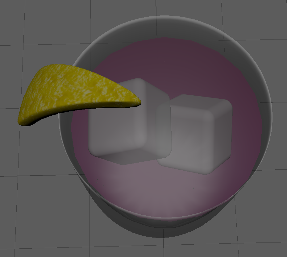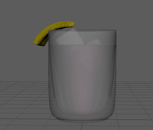 To start with I added a cylinder which i extruded and remove the top set of faces, afterwards I created another cylinder which I curved the bottom to make it smaller than the top half, this was going to be my liquid inside the glass, to top this model off I added 2 cubes, i beveled these 2 cubes and stretched them a little bit, these were to be my ice cubes. I also made a lemon which was a sphere cut into a small piece and then extruded upon the remaining vertices.